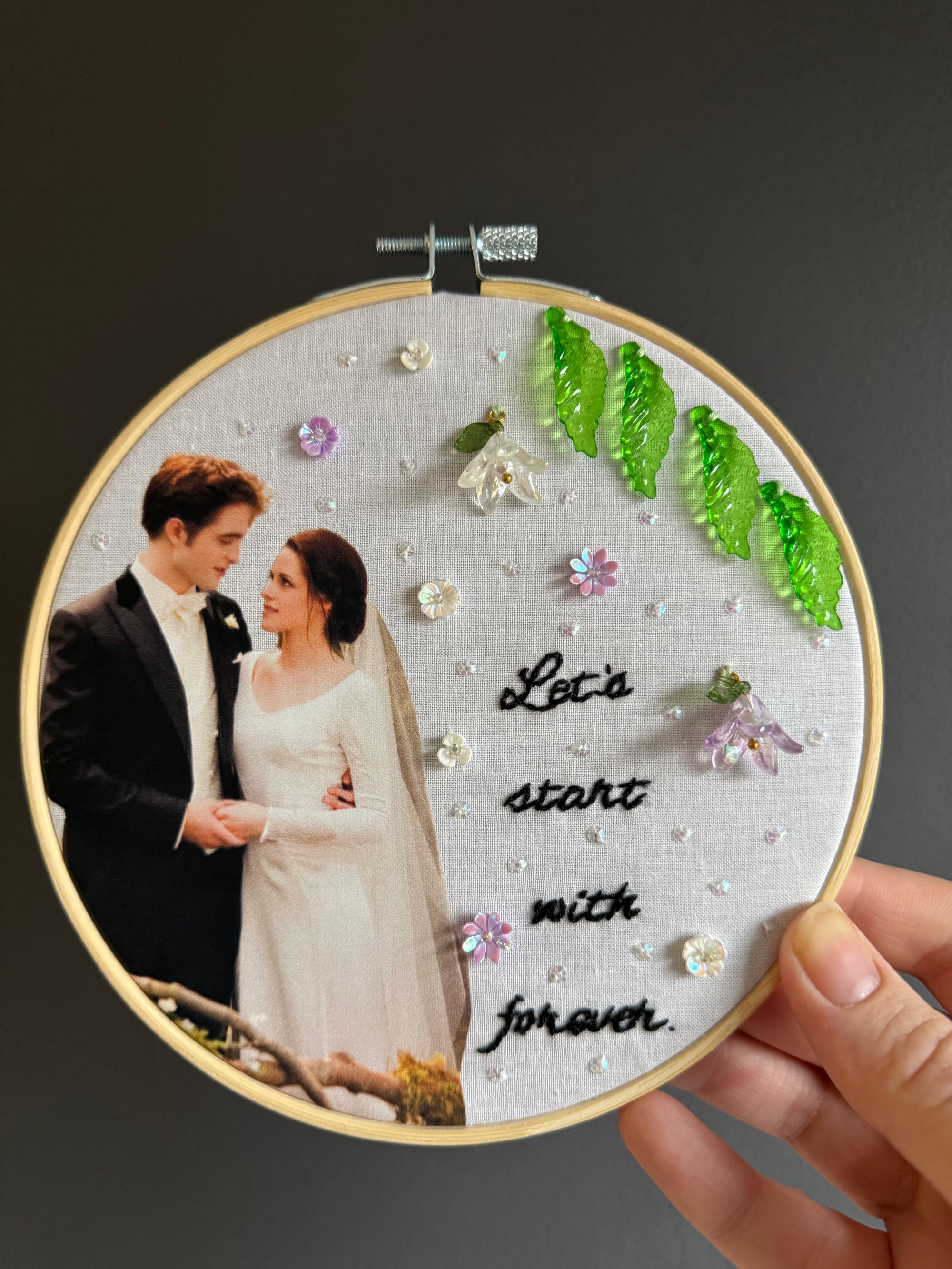 Item will be framed in a 6 in hoop and will include a photo and a max 35 letter beads, 3 colors of sequins and mini sequins and 4-10 beads or charms in corresponding colors and embroidery around photo.